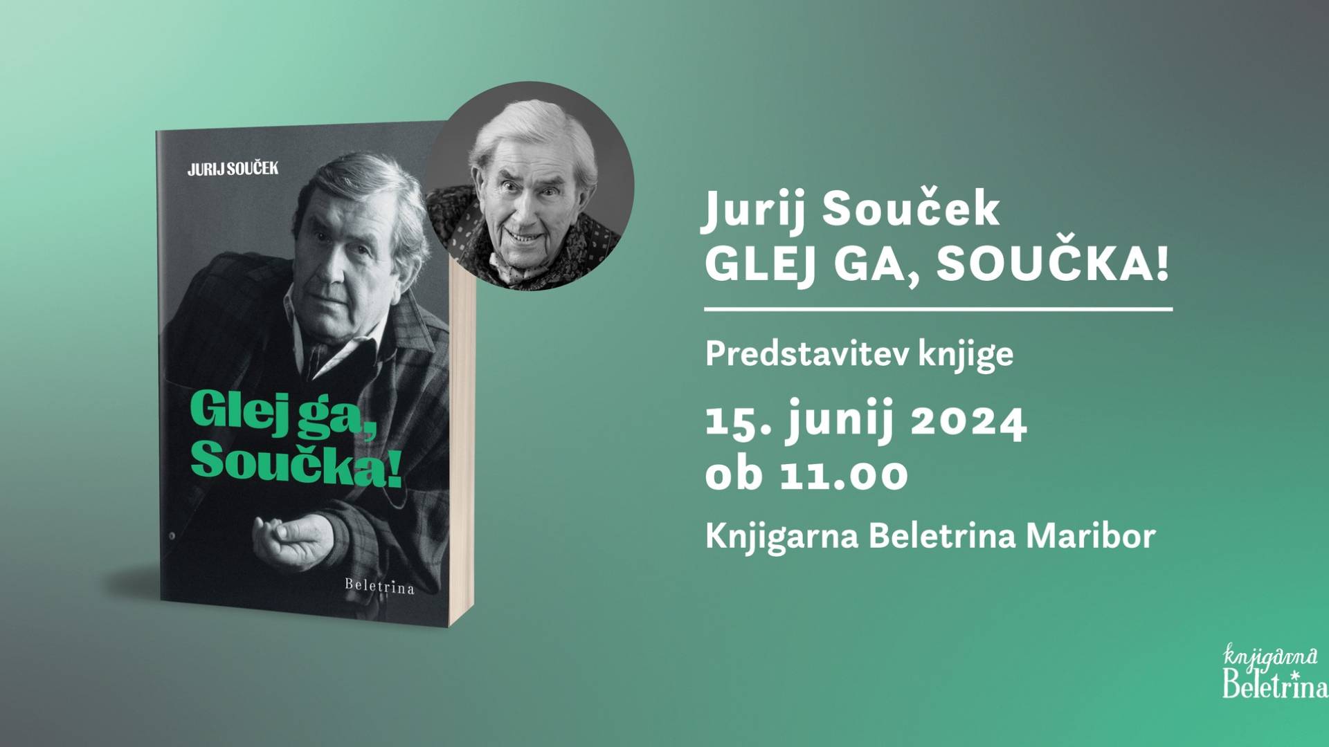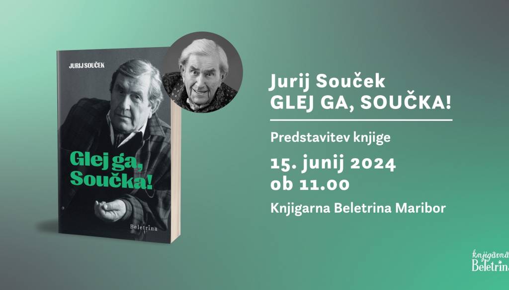 Grajski trg, 2000 MariborV soboto, 15. junija 2024, ob 11. uri bo v sklopu Borštnikovega srečanja v Knjigarni Beletrina Maribor predstavitev biografije Glej ga, Součka! kultnega slovenskega dramskega, filmskega in televizijskega igralca Jurija Součka, ki se je od nas poslovil v začetku letošnjega leta. Vabljeni!