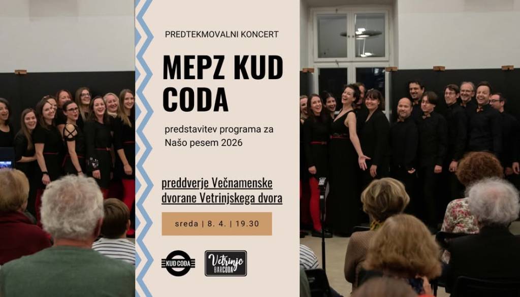 Večnamenska dvorana Vetrinjski dvorMePZ KUD Coda je v 10. letu delovanja prvič uvrščen na državno zborovsko tekmovanje Naša pesem, ki bo 18. aprila v Mariboru. Navada, ki se je doslej izkazala kot dober recept, je predtekmovalni koncert, na katerem našim ‘domačim’ pokažemo program, s katerim ciljamo na najboljše rezultate.