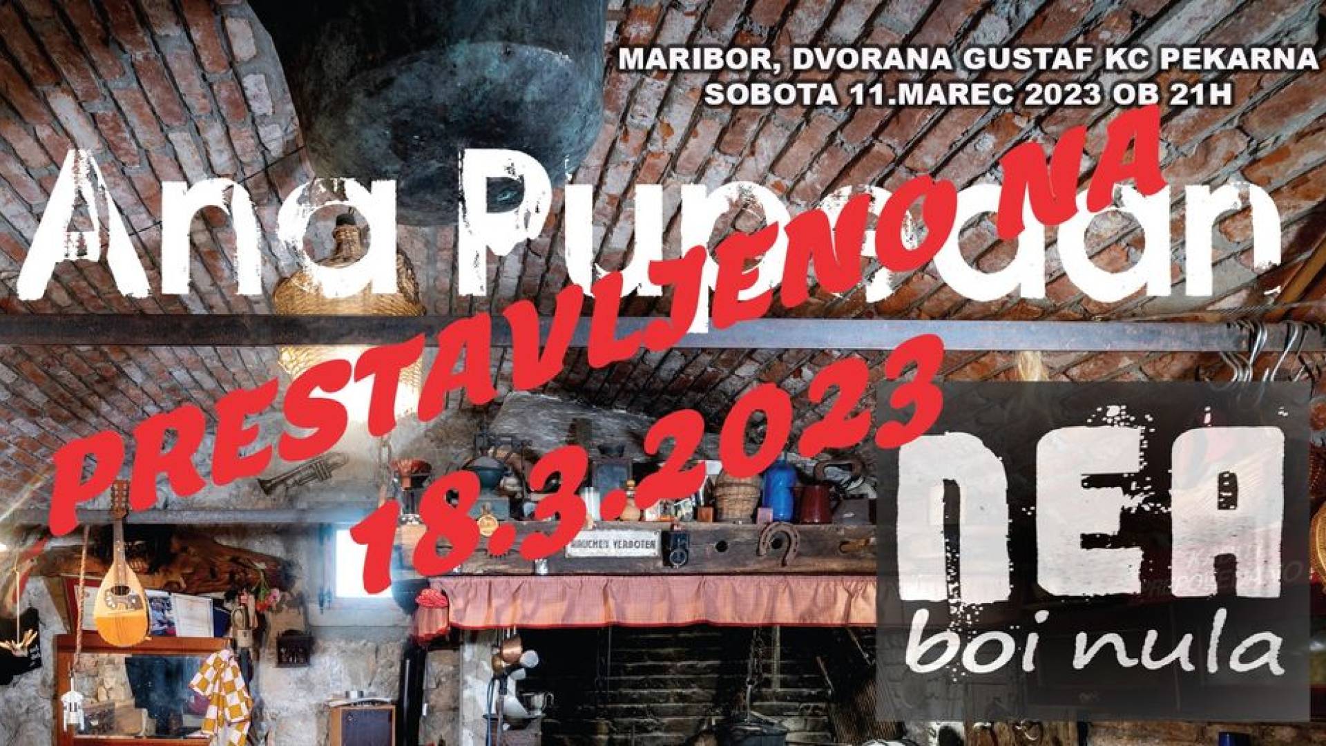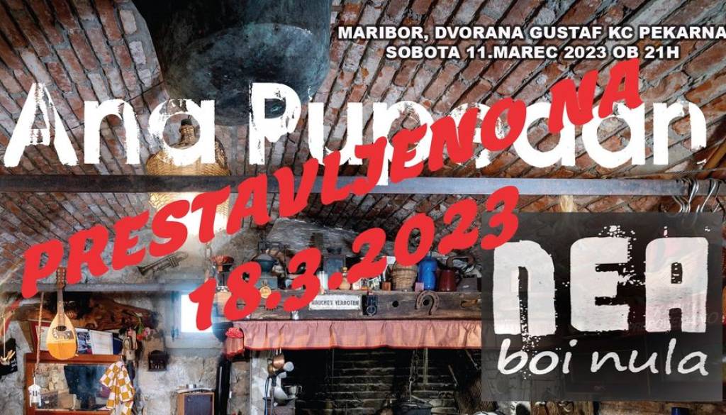 Dvorana Gustaf Pekarna Ob železnici 16 Mariboržal zopet prestavljen koncert Ana Pupedan in sicer na soboto 18.3.2023, že kupljene karte veljajo za novi termin.