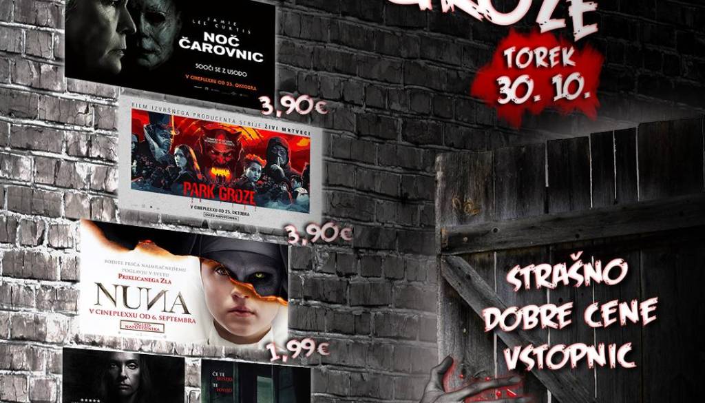 Cineplexx MariborZa vse navdušence grozljivk in srhljivk prihaja NOČ GROZE. V torek, 30. oktobra bodo v vseh Cineplexx kinih izbrane grozljivke PO STRAŠNO DOBRIH CENAH. Na sporedu bodo Noč čarovnic, Park groze, Nuna, Podedovano zlo in Tiho mesto.