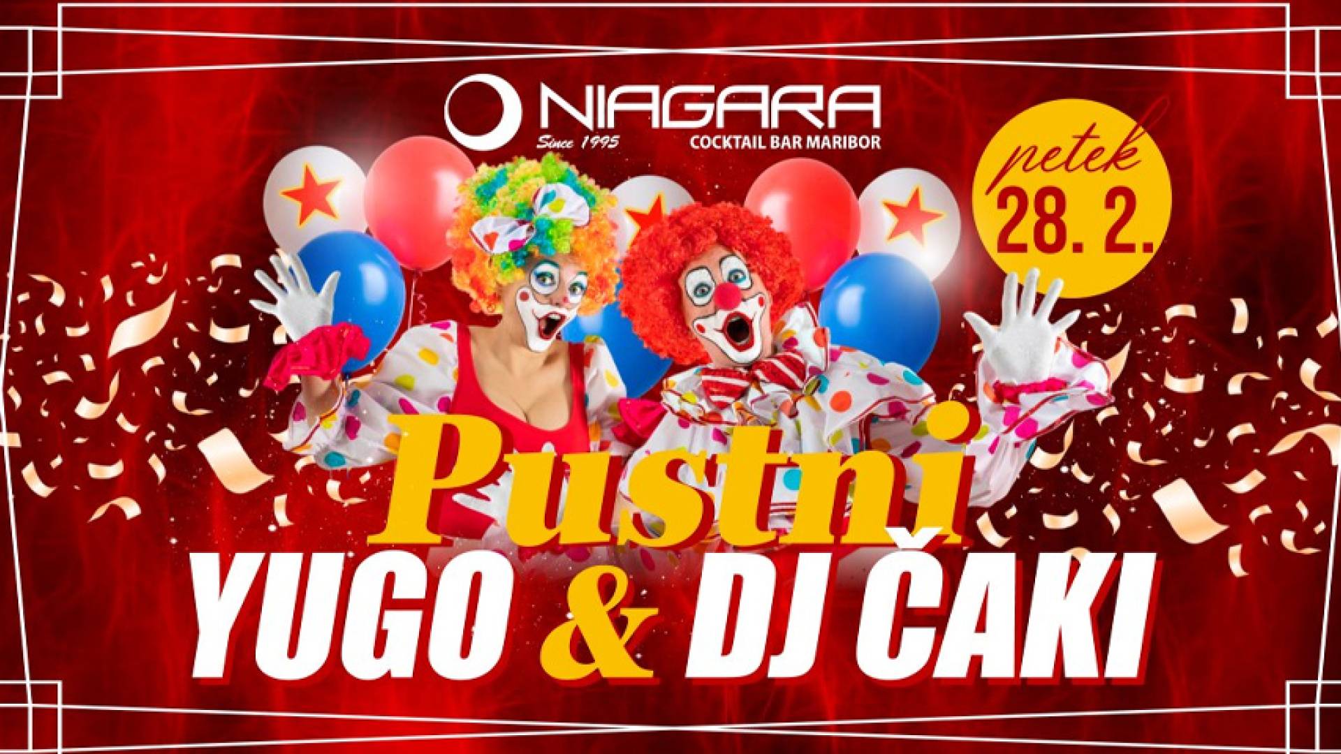 Niagara Cocktail Bar - MariborPetek, 28. februarja, bo v Niagari eksplozija pustne zabave, kakršne še nismo doživeli! Pripravi se na nepozaben večer, poln divjega plesa, norega vzdušja in legendarnih Yugo pop & rock hitov, ki jih bo vrtel DJ Čaki! 🎶