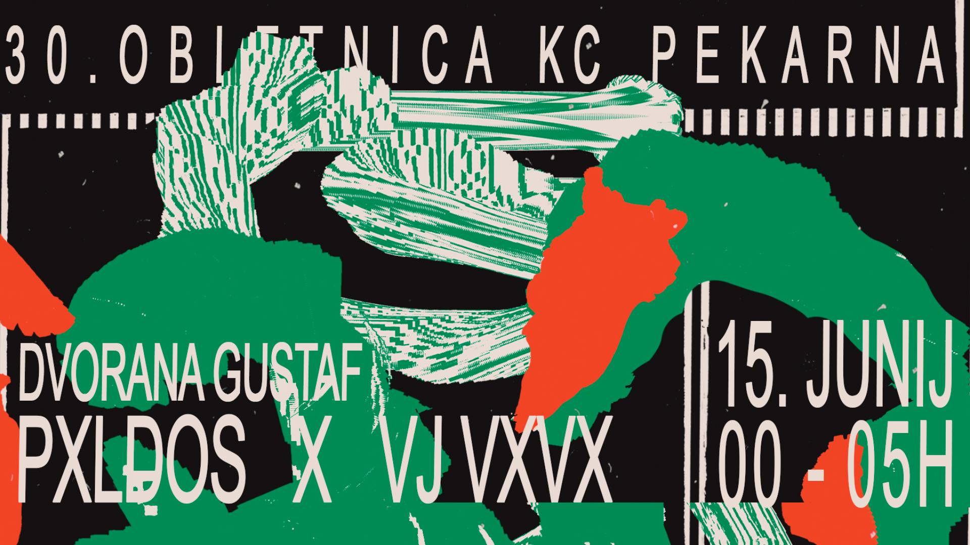 Dvorana Gustaf PekarnaV okviru 30.obletnice KC Pekarna, Marko / PXLDOS / glasba / in Vita / VXVX / vizualije / po krajšem predahu ponovno združujeta svetove.