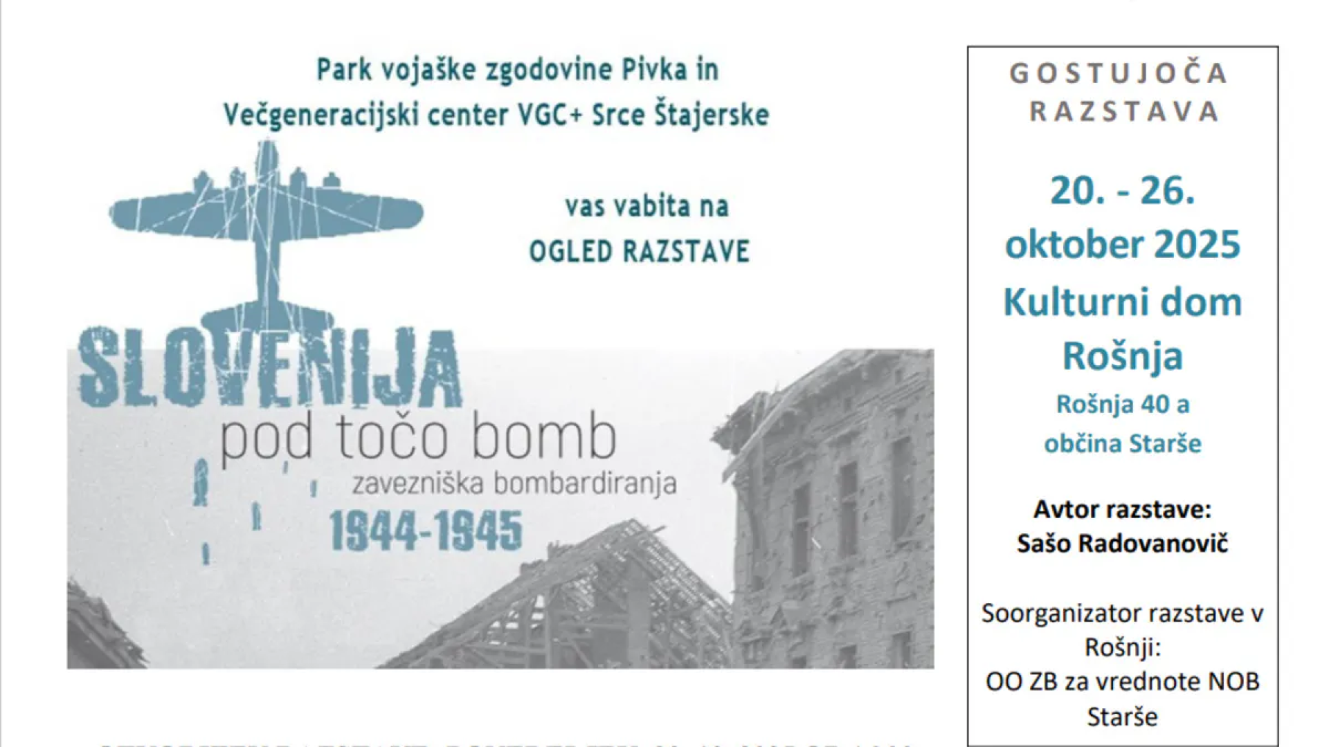 RAZSTAVA BOMBARDIRANJA SLOVENIJE gregor1 | 19. oktober 2025 13:40 v Kultura Termin Ponedeljek, 20. oktober 2025 10:00 Lokacija Kulturni dom Rošnja RAZSTAVA BOMBARDIRANJA SLOVENIJE