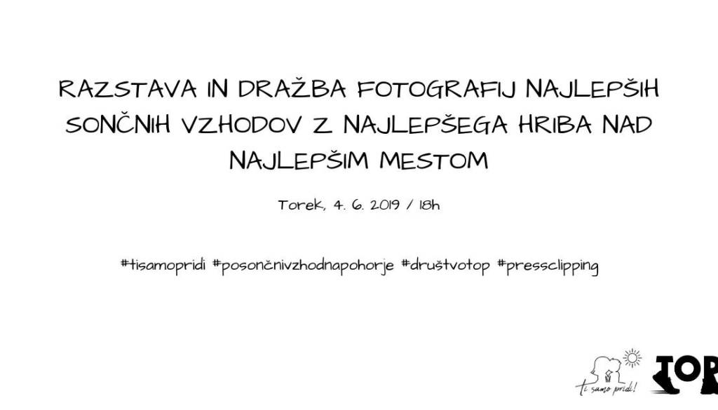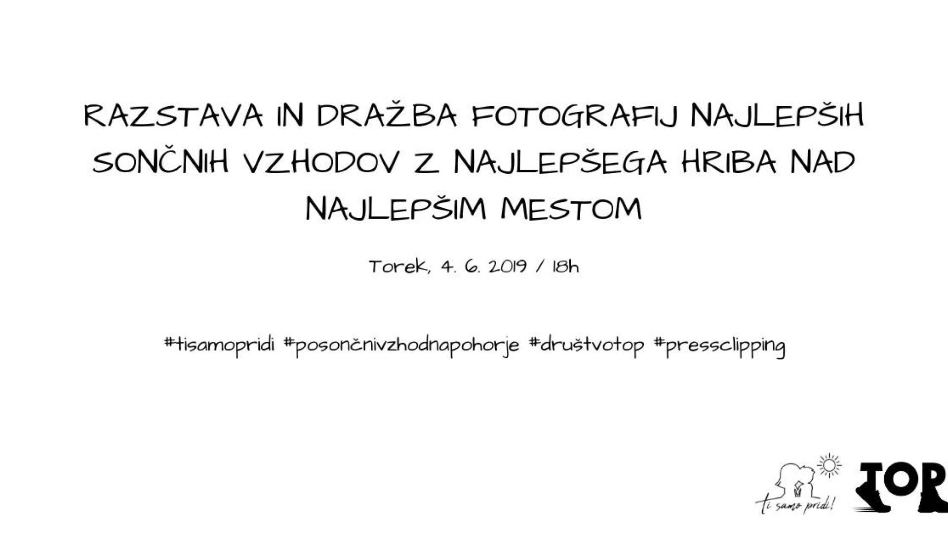 Razstava se bo pričela z dobrodelno dražbo treh izbranih fotografij v torek, 4. junija 2019, ob 18. uri. Sredstva zbrana z dražbo bodo razdeljena med Društvo Up-ornik in Društvo TOP – tek, organizacija, pohodništvo. Medtem ko Društvo UP-opornik skrbi za socialno šibkejše ljudi in družine, si Društvo TOP prizadeva za organizacijo rednega gibanja in druženja v naravi za vse kategorije populacije. Društvo TOP je glavni organizator dogodka Po sončni vzhod na Pohorje | 21. 6. 2019, med glavne cilje za leto 2019 pa je uvrstilo še redno vadbo pod okriljem Mariborskih tekačev, organizacijsko in komunikacijsko podporo drugim društvom s podobnim poslanstvom ter podporo urejanju pohodniških in tekaških poti v Mariboru in okolici.