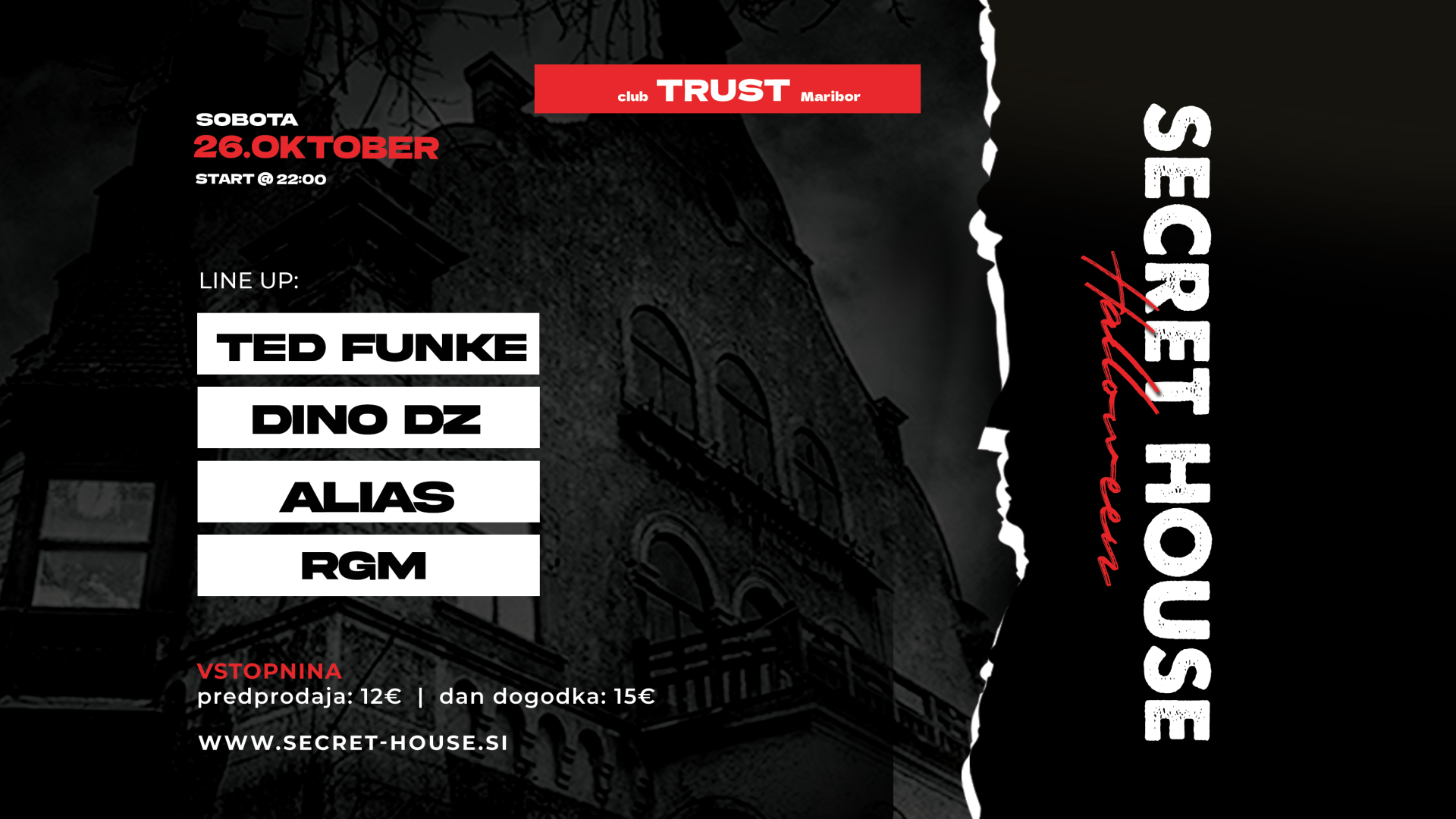Klub TrustHouserji pozor! 26.10. se vrača tradicionalni Secret Halloween House tja, kamor se je pred tremi leti zgodba začela, v klub Trust! , V temačnem underground klubu, bomo za 3. obletnico Secret House-a s pravim house-om izpod rok rezidentov Ted Funke, Dino DZ, Alias ter RGM preplesali najstrašnejšo noč v letu! 👻💃🕺 Vstopnice so na voljo na: www.secret-house.si