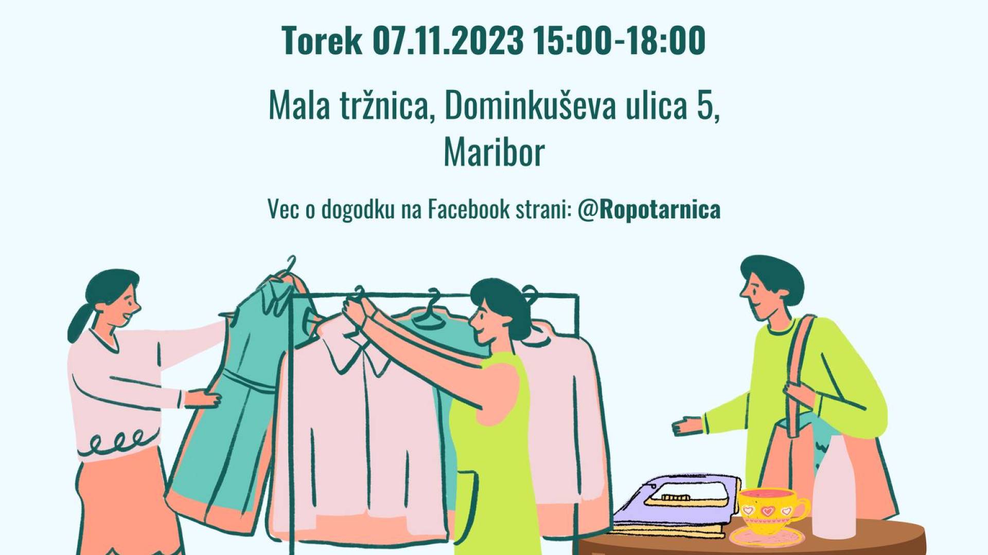 Mala tržnicaV torek, 7.11.2023, od 15:00 do 18:00, bo na Mali tržnici na Dominikusovi ulici 5 v Mariboru potekal še en sejem izmenjave in ponovne uporabe oblačil in stvari. Prinesi stvari, ki jih ne potrebuješ več, in jih zamenjaj za nekaj, kar ti je všeč. To je priložnost, da se znebiš stvari, ki jih ne uporabljaš več, in najdeš nove zaklade. Pridruži se nam na druženju, kjer bomo skupaj zmanjšali odpadke in spodbujali ponovno uporabo. Se vidimo!