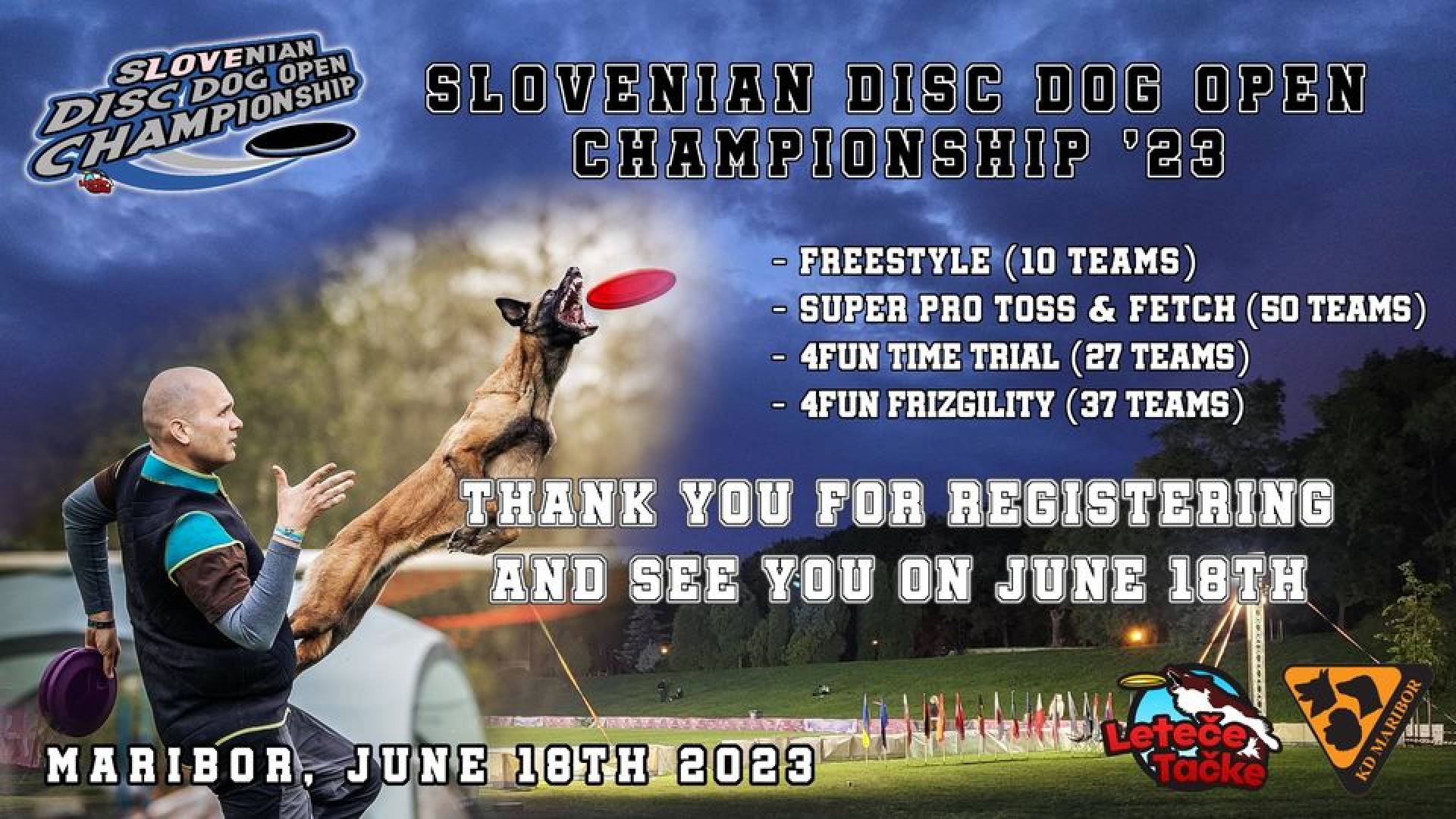 Kinološko društvo MariborLeteče Tačke and Dog Frisbee Team Slovenija are, as part of preparation for European Championship 2023, organising Slovenian Disc Dog Open 2023 with DogFrosbee and DogFitness workshop with Patrik Szőcs and Ľubka Barassóová.