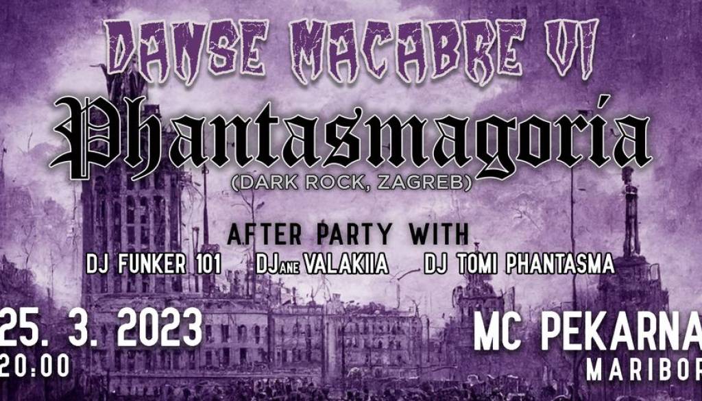 Tokrat se na ples mrtvih vračajo EX-YU legende PHANTASMAGORIA, ki širijo ekstazo melanholije že od konca 80-ih. Skupina je tik pred korono doživela renesanso, ne le s ponovnim nastopanjem v živo, ampak tudi na internetu. Med drugim je njihov komad Poziv u raj presegel pol milijona ogledov! Po koncertu bo sledil tematski AFTER-PARTY s tremi DJ-i!