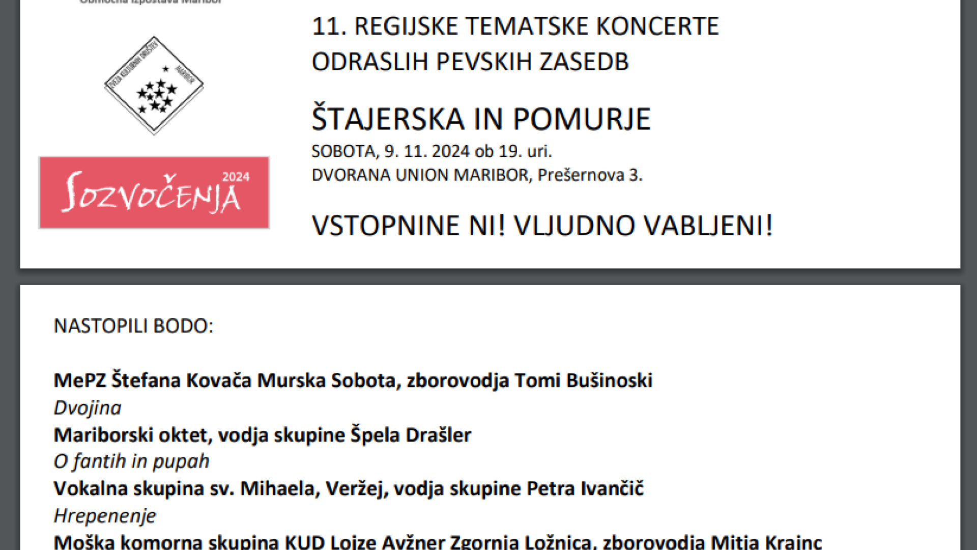 - Muta, dvorana Kienhofen, sobota, 16. 11. 2024, ob 17.00 (Od Celja do Koroške),