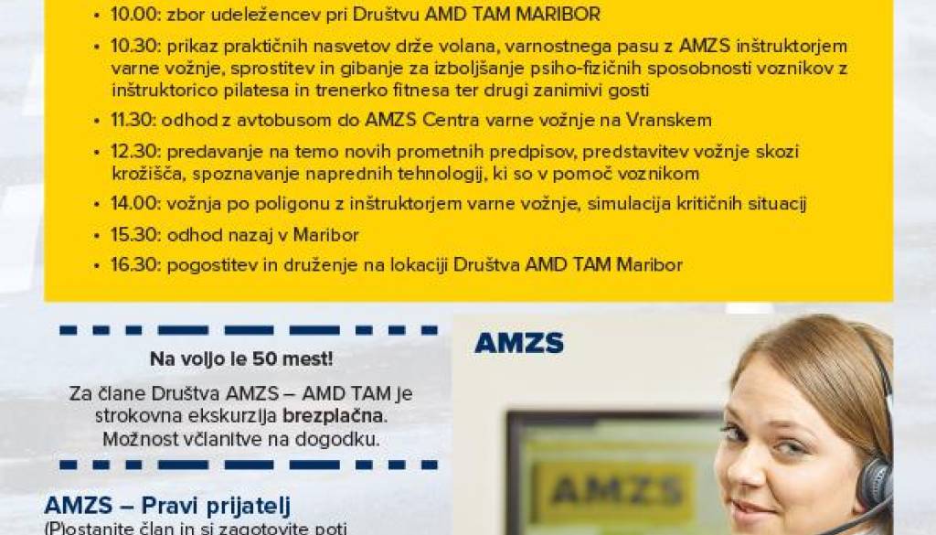 Program dogodka: 10.00: zbor udeležencev pri Društvu ADM TAM Maribor 10.30: prikaz praktičnih nasvetov drže volana, varnostnega pasu z AMZS inštruktorjem varne ...