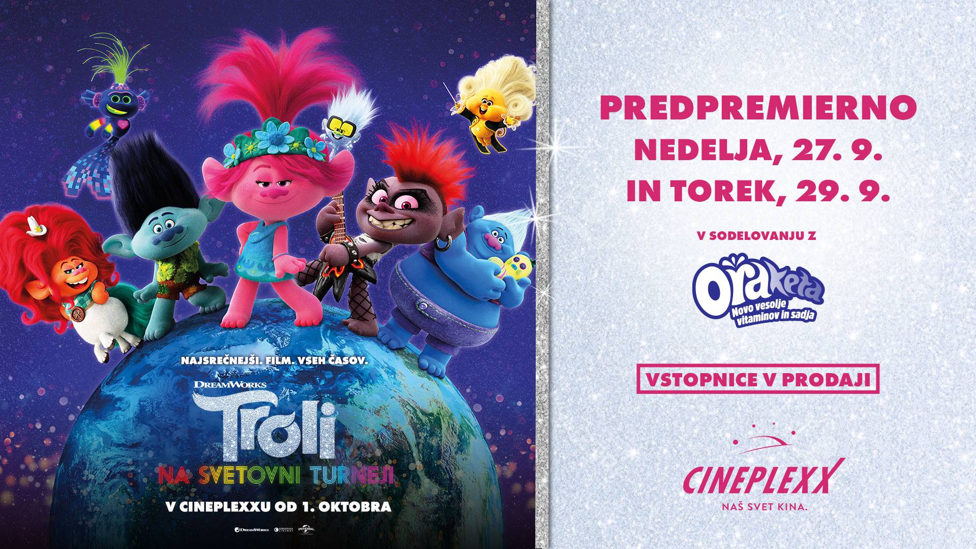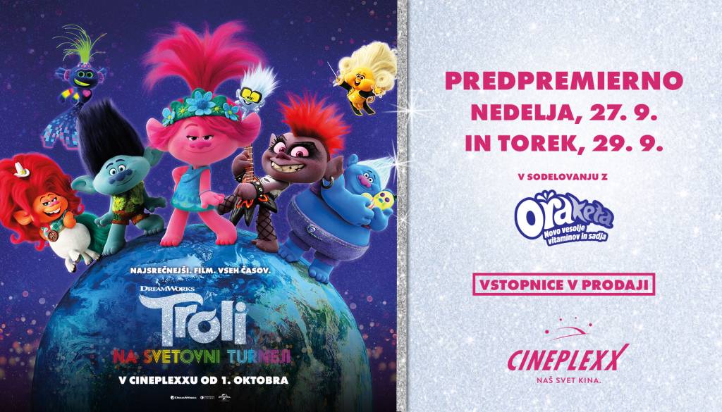 Po štirih letih se majcena bitja, ki ljubijo ples in glasbo vračajo na velika platna v animirani glasbeni pustolovščini TROLI NA SVETOVNI TURNEJI. Oglejte si Trole med prvimi – predpremierno že v torek, 29.9, ko bo z nami tudi ORAKETA – novo vesolje vitaminov in sadja.