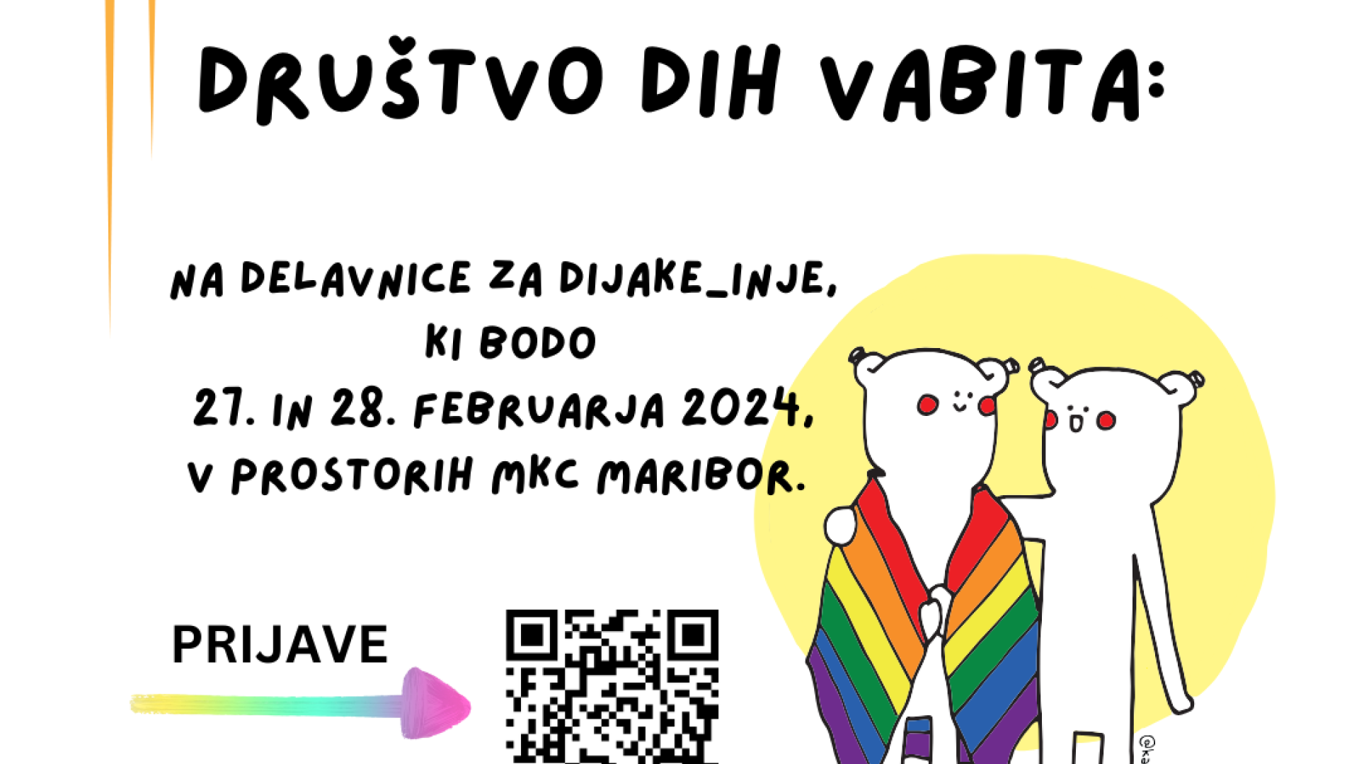 MKC Maribor, Ob železnici 16, MariborMaribor Pride (MKC Maribor) in Društvo DIH vabita na dvodnevne delavnice, ki bodo potekale 27. in 28. februarja, med 10. in 17. uro, v prostorih MKC Maribor.