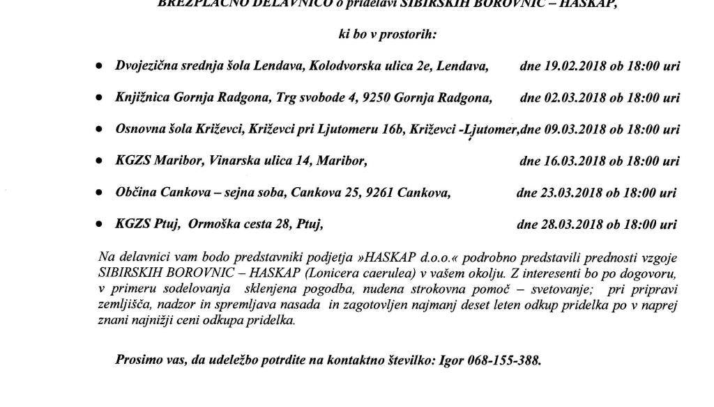 VABILO NA PREDAVANJE Z NASLOVOM NOVE PRILOŽNOSTI V PRIDELAVI JAGODIČASTEGA SADJA Haskap Sibirska borovnica | 5. marec 2018 11:06 v Termin Petek, 16. marec 2018 18:00 - Petek, 16. marec 2018 20:00 Lokacija KGZS Maribor, Vinarska ulica 14, Maribor Vljudno vabljeni.