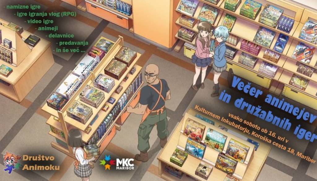 Kulturni inkubator, Koroška ulica 18, MariborV Kulturnem inkubatorju bo v soboto, 3. junija 2023, v organizaciji društva Animoku potekal prvi dogodek v sklopu serije druženj, ki se bodo zvrstili pod skupnim imenom Večer animejev in družabnih iger.