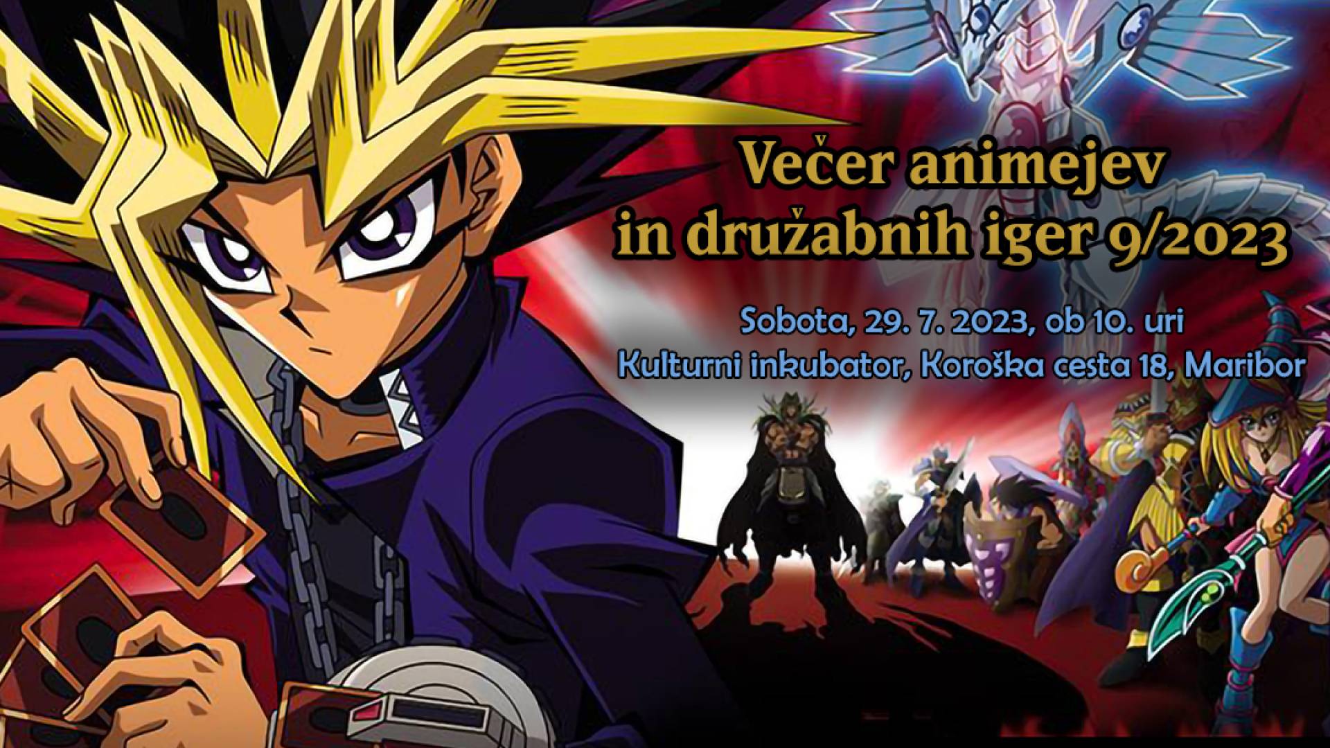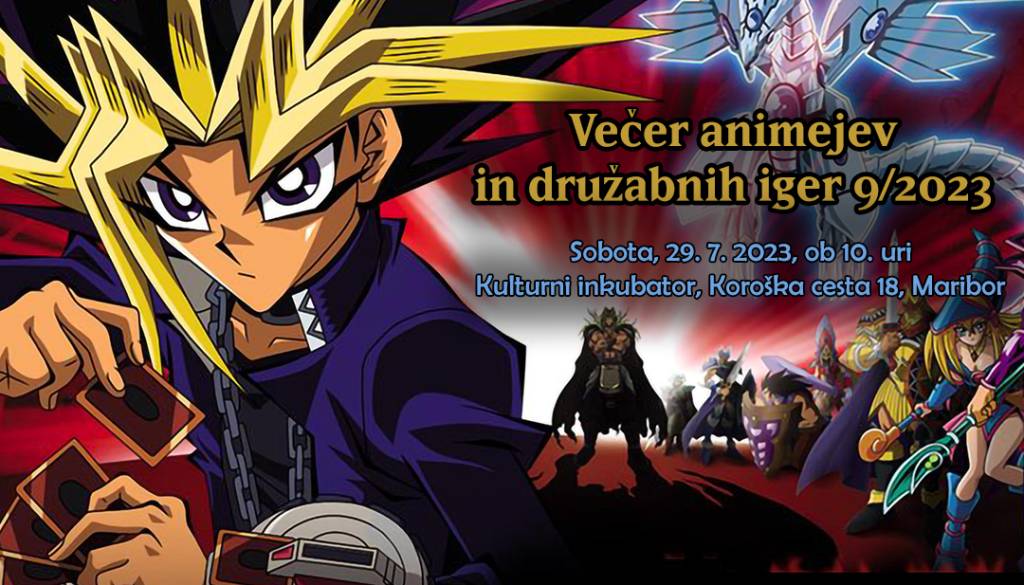 Kulturni inkubator, Koroška ulica 18, MariborDruštvo Animoku in MKC Maribor v soboto, 29. julija, ponovno vabita na Večer animejev in družabnih iger v Kulturni inkubator, ki se bo tokrat izjemoma odvijal ob zgodnejši uri, in sicer med 10. in 16. uro.