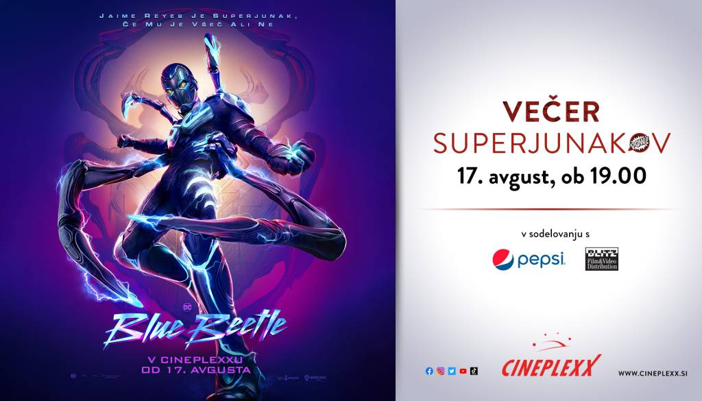 Cineplexx MariborV četrtek, 17. avgusta, ob 19:00, ne zamudi VEČERA SUPERJUNAKOV s filmom BLUE BEETLE.