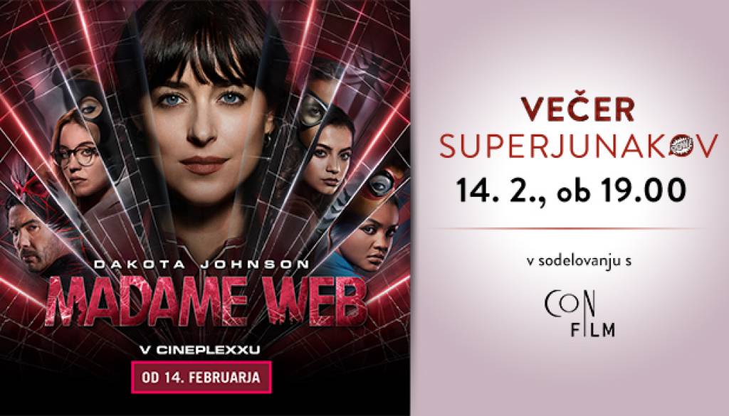 Cineplexx MariborPredpremierno, v sredo, 14. februarja, ob 19:00, ne zamudi VEČERA SUPERJUNAKOV s filmom MADAME WEB.