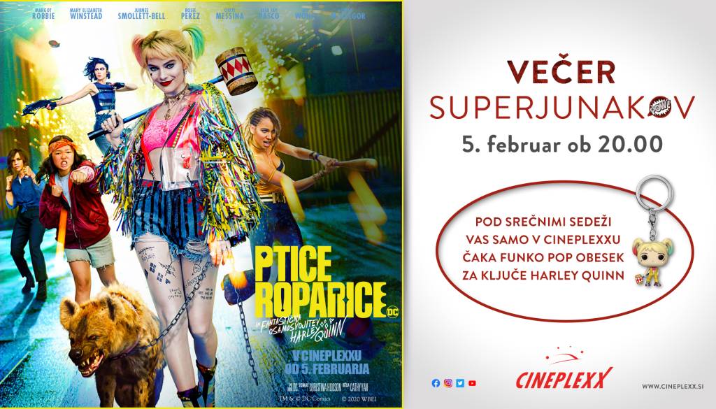 Februar bomo v Cineplexxu Maribor začeli z Večerom Superjunakov in filmom Ptice roparice in fantastična osamosvojitev Harley Quinn. Pridružite se nam v sredo, 5. februarja ob 20:00. Pod srečnimi sedeži vas bodo samo v Cineplexxu čakali Funko Pop obeski za ključe z motivom Harley Quinn.