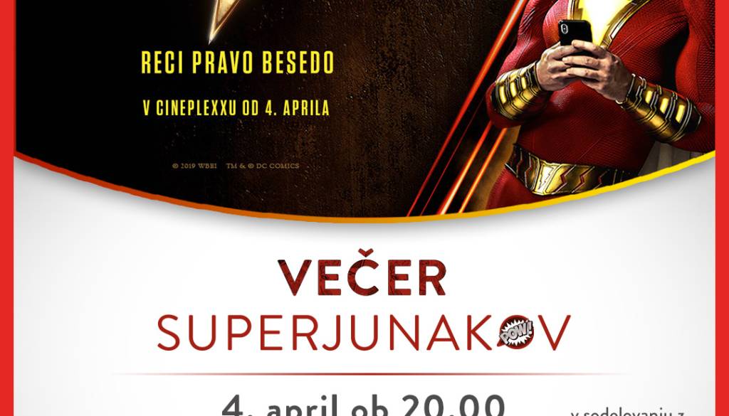 Cineplexx MariborŠazam (Shazam) je nov DCjev junak, ki prihaja na velika platna. V četrtek, 4. aprila na Večeru superjunakov v Cineplexx kinih preverite kdo je zabavni superjunak Šazam in ali mu bo uspelo premagati hudobnega zlikovca?