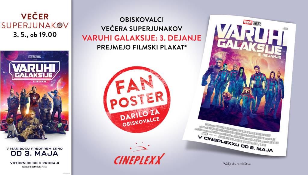 Cineplexx MariborPREDPREMIERNO, v sredo, 03. maja, ob 19:00, ne zamudi VEČERA SUPERJUNAKOV s težko pričakovanimi VARUHI GALAKSIJE: 3. dejanje.