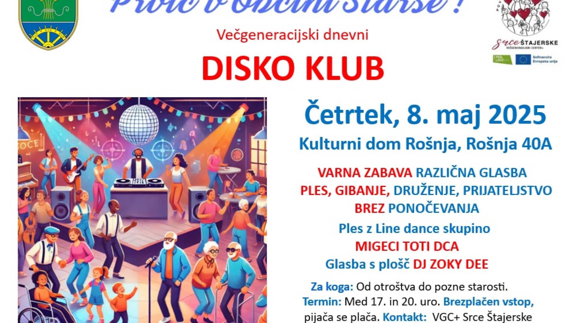 Kulturni dom Rošnja8. maja (četrtek) bo ob 17. uri prvič Večgeneracijski dnevni DISKO KLUB v občini Starše, kakršnega smo v Mariboru priredili že tri krat in se je izkazal za pravi hit.