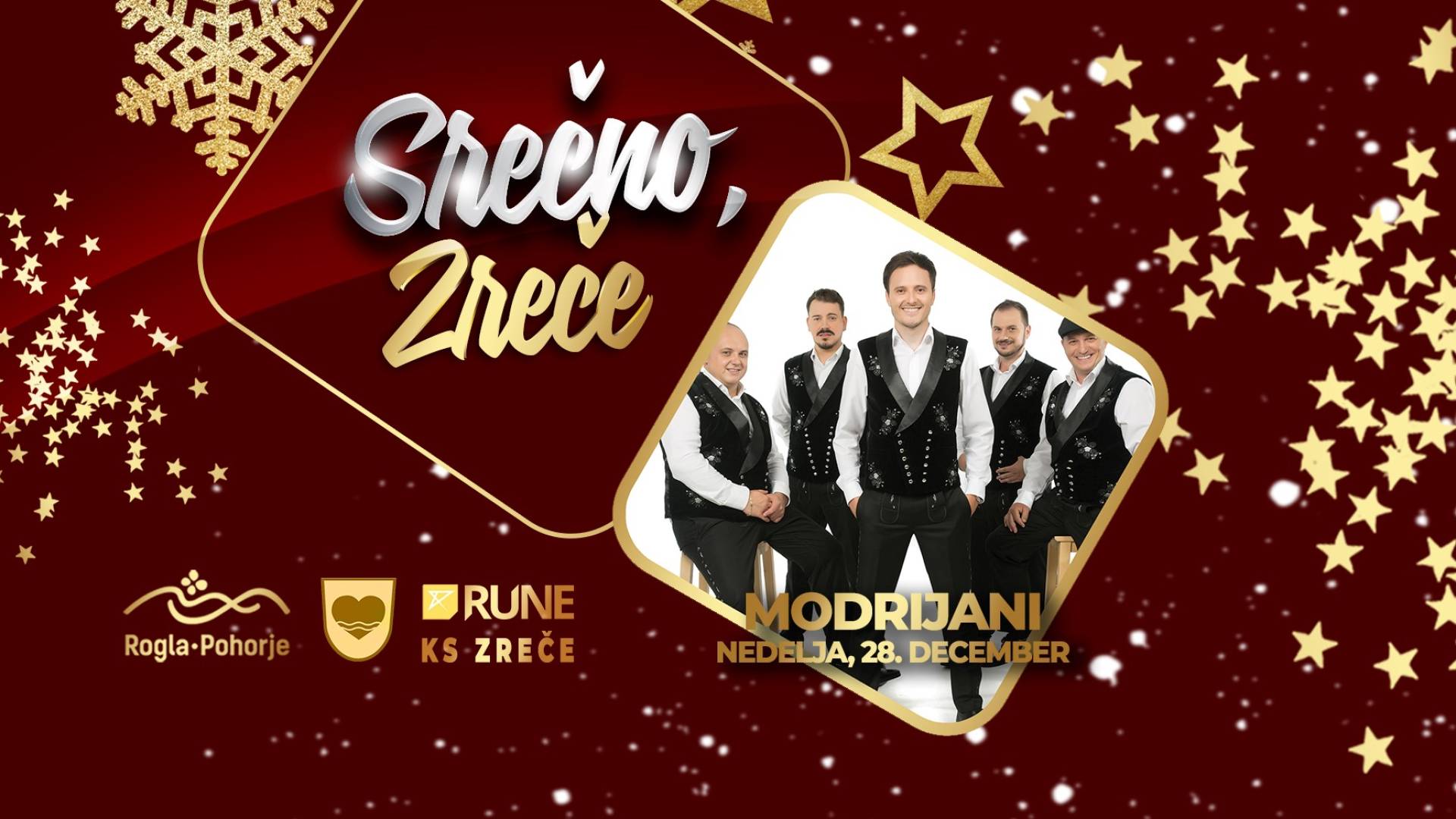 Srečna ploščad ZrečePripravite se na skorajda tradicionalno zabavo, saj so Modrijani v Zrečah že velikokrat poskrbeli za nepozabno vzdušje. In tako bo tudi zadnjo nedeljo v decembru.Kaj nas čaka? - Velika zabava z Modrijani, poznanih po hitih kot so Ti, moja rožica, S tabo res rad in Moja - Praznična dekoracija in številne lučke 28. 12. 2025 ob 19. uri Lokacija: Parkirišče pred občino Zreče