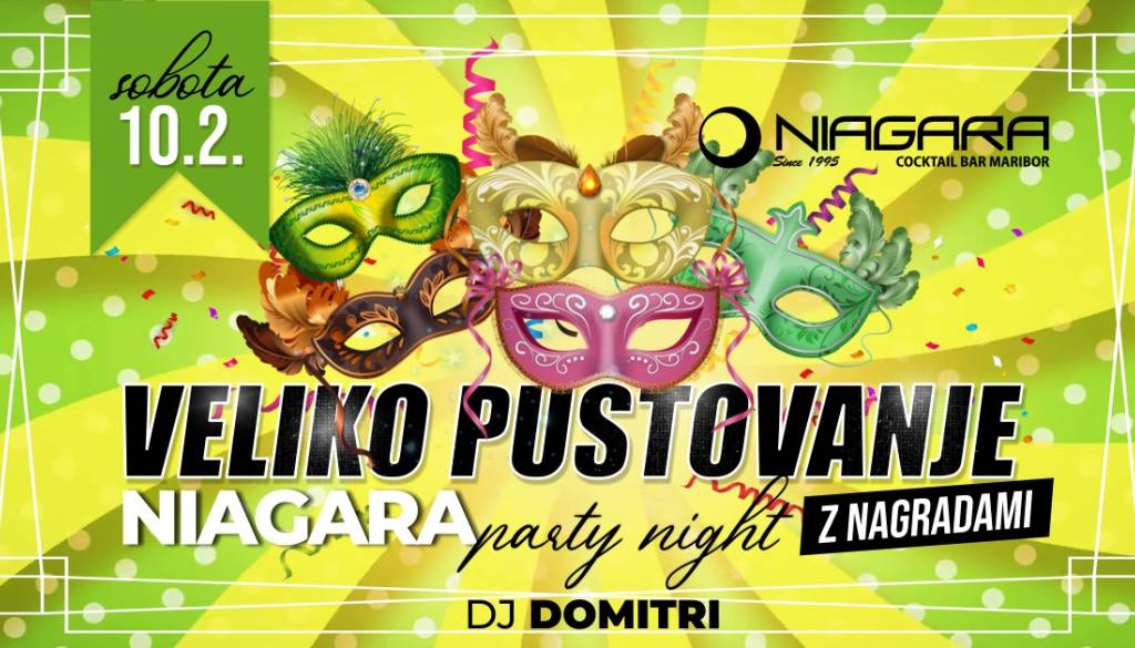 NIAGARA Lounge BarČaka nas VELIKO PUSTOVANJE z NAGRADAMI! 👈 V soboto, 10. 2. 2024 vas razvajamo s party glasbo izpod rok DJ Domitrija. Podelili bomo bogate nagrade skupinskim in individualnim maskam! 🐭