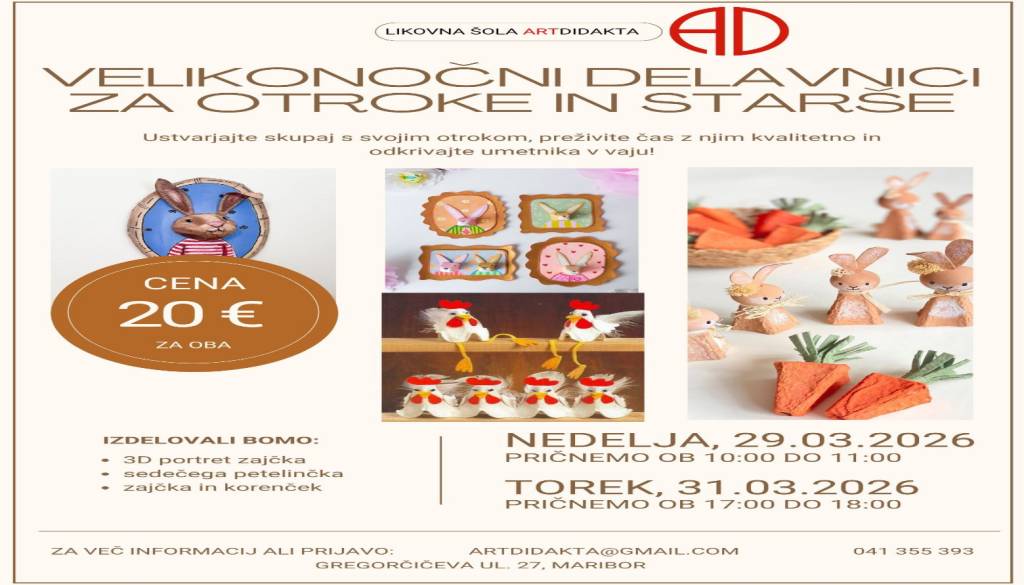 Velikonočni delavnici za otroke in starše ponujata prijetno priložnost za skupno preživljanje prostega časa, ustvarjanje in druženje. Udeleženci bodo skupaj izdelovali unikatne 3D izdelke iz recikliranega kartona – prikupen portret zajčka, sedečega petelinčka, zajčka ter korenček.