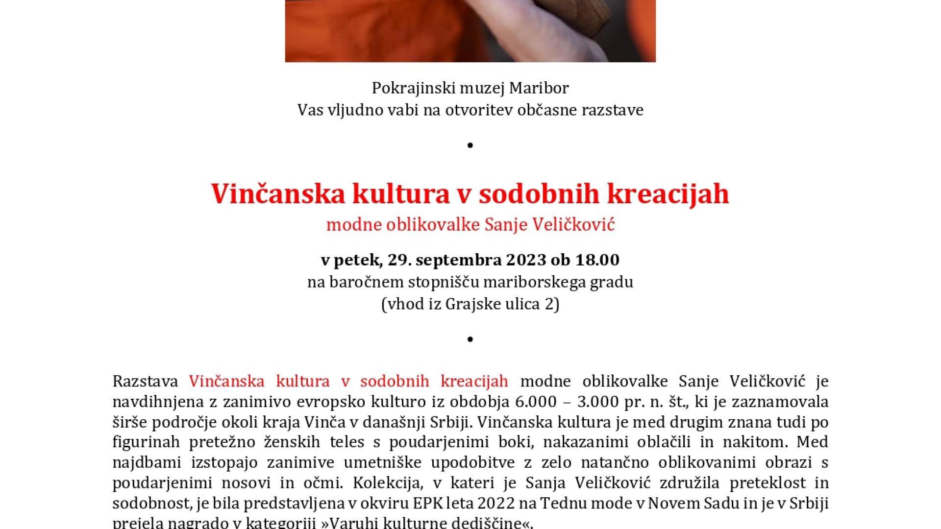 Viničanska kultura v sodobnih kreacijah Jana Bohar | 19. september 2023 09:21 v Kultura Termin Petek, 29. september 2023 18:00 Lokacija Mariborski grad Vabljeni!