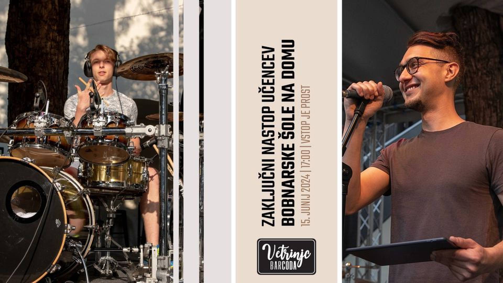 Vetrinjc - BarCodaPridite in se nam pridružite na tradicionalnem zaključnem nastopu Bobnarske šole na domu! Učenci bodo stopili na oder, da vam pokažejo, kaj so se naučili skozi vse leto. Pričakujte večer poln ritma, bobnov in glasbe.