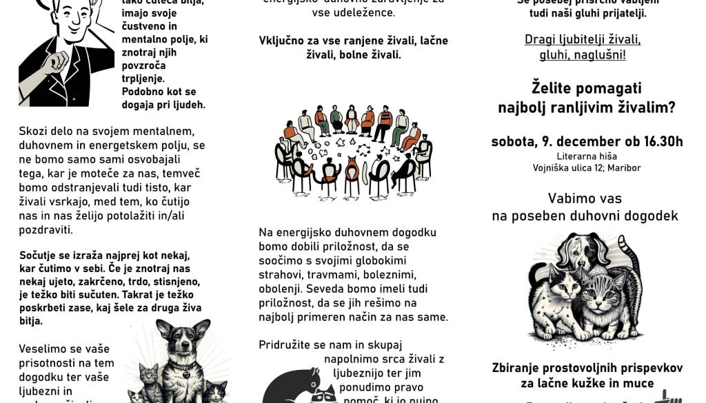 Zbiranje prostovoljnih prispevkov za lačne kužke in muce Jana Bohar | 28. november 2023 11:59 v Ostalo Termin Sobota, 9. december 2023 16:30 Lokacija Literarna Hiša Maribor Vabljeni!