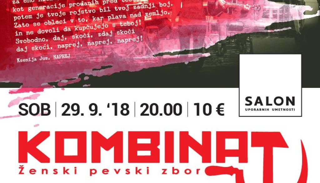 Salon uporabnih umetnosti Glavni trg 1 MariborZ rdečo kredo pisati izročilo upora. Ne na stene, na ušesne membrane. V časih, ko se polja svobode ožijo, pevke in spremljajoči glasbeniki Ženskega pevskega zbora Kombinat za arzenal v boju proti krčenju fizičnega in mentalnega javnega prostora izbirajo - pesmi upora. Združeni v prepričanju, da je upor ena osnovnih človekovih pravic, zaupajo, da iz uporne drže vzklije kritična misel. Iz spoštovanja do vseh, ki so dvignili glas in dali življenja, obujajo pesmi, ki so hrabrile duha v revolucijah in uporih širom sveta in jih prepevajo v izvirnih jezikih. Te za njih niso le uglasbene besede, marveč dragocena in pretresljiva pričevanja človekove vere v lepši svet. Za solidarnost, srčnost, socialno pravičnost, tovarištvo in pogum. Za vse ljudi.