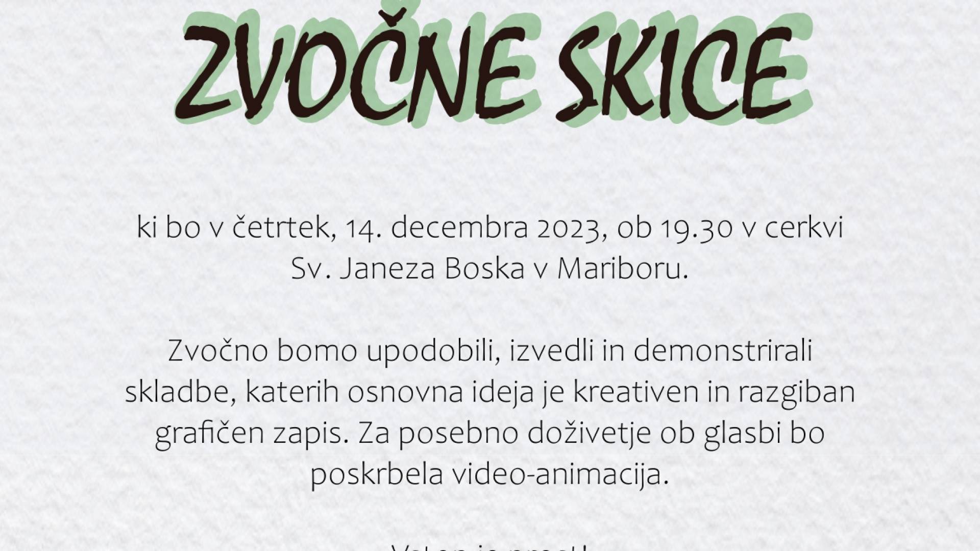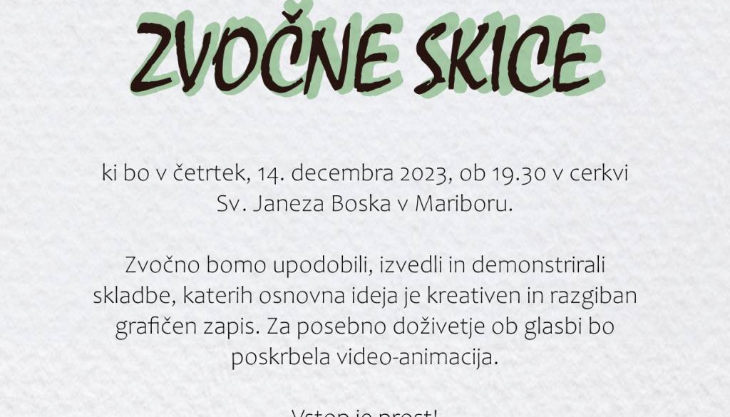 Cerkev sv. Janeza Boska v MariboruVljudno vabljeni na koncert Akademskega pevskega zbora Maribor imenovanega Zvočne skice, ki bo 14. decembra 2023, ob 19.30 v cerkvi sv. Janeza Boska (pri Qlandiji Maribor).
