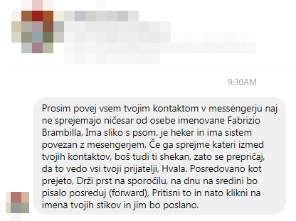 Na družbenem omrežju Facebooku kroži sporočilo, v katerem je posamezniki opozarjajo, naj ne sprejmete prošnje za prijateljstvo od osebe Fabrizio Brambilla, saj da je ta heker. Domnevno naj bi Fabrizio že imel svoj sistem povezan z vašim računom. Sporočilo tudi opozarja, če kdo izmed vaših prijateljev sprejme njegovo sporočilo, virus prejmete tudi vi.