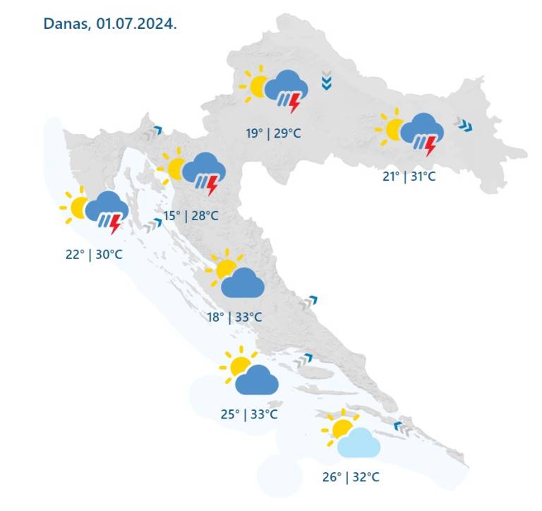 V notranjosti in na severnem Jadranu bodo ponekod plohe in nevihte, v osrednji in vzhodni Hrvaški so možni krajevno močnejši nalivi, navaja Državni hidrometeorološki zavod.