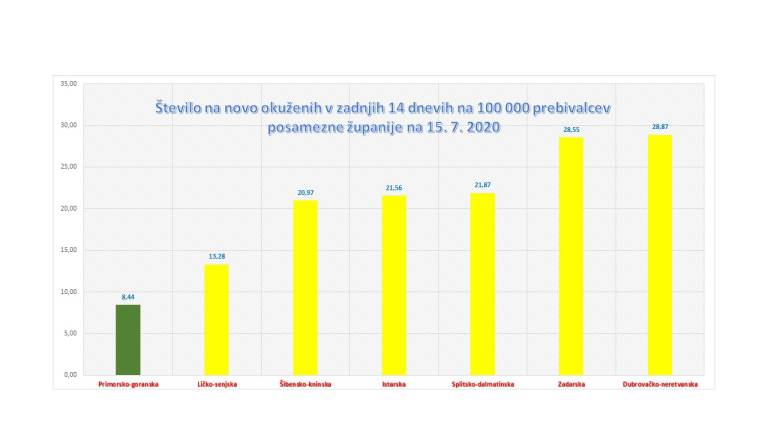 Primorsko-goranska županija Hrvaške je varna, število novo okuženih v zadnjih 14 dneh na 100 000 prebivalcev tam znaša le 8,44.