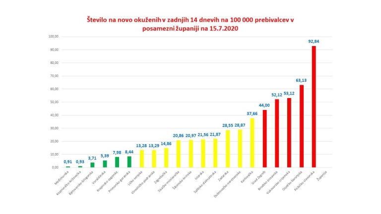 V rdečem območju so Zagreb, Brodsko-posavska, Vukovarsko-srijemska, Osječko-baranjska in Požeško-slavonska županija.