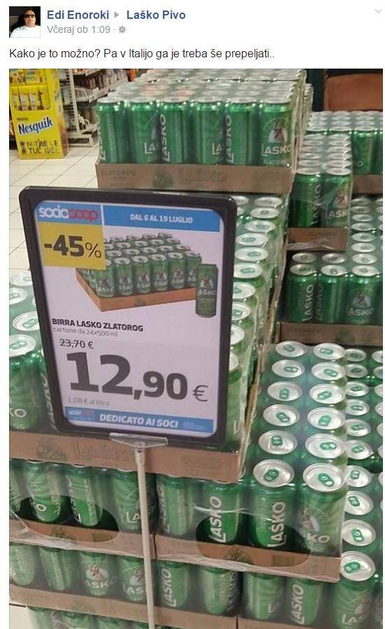 Po medmrežju je zaokrožila fotografija, ki jo je uporabnik Facebooka delil na uradno stran Pivovarne Laško. Na njej opozarja na neverjetno nizko ceno za karton štiriindvajsetih Laško piv v sosednji Italiji. Pri zahodnih sosedih je namreč karton priljubljenega zelenega zvarka mogoče dobiti za slovenske kupce nepredstavljivih - 12,90 evrov!