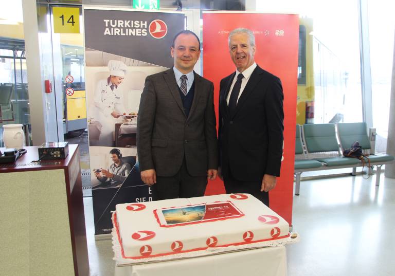 Hüseyin Güzel, generalni direktor Turkish Airlines v Gradcu, in Gerhard Widmann, generalni direktor graškega letališča, sta s torto proslavila pristanek prvega letala iz novega istanbulskega letališča.