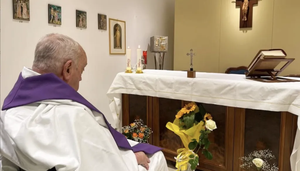 Od sprejema v bolnišnico 14. februarja je bil papež v javnosti samo ob odhodu iz bolnišnice, ko je z njenega balkona v invalidskem vozičku pozdravil več sto zbranih vernikov.