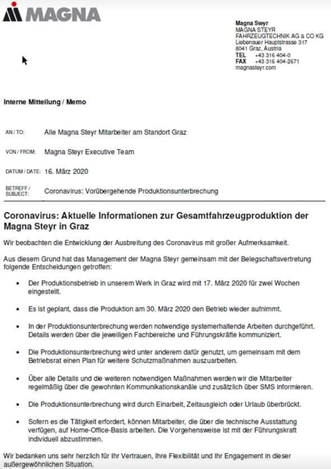 Koronavirus je prizadel tudi avtomobilsko industrijo, zato se v avstrijski Magni odločili, da od danes do 30. marca ustavijo proizvodnjo v Gradcu. V tamkajšnjem obratu proizvajajo vozila za Mercedes, BMW in Jaguar, zaposlenih pa je več kot 10 tisoč ljudi, od tega več kot 1000 Slovencev.