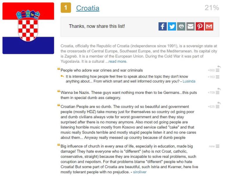 Pod vsako državo, ki se je znašla na tem seznamu lahko uporabniki podajo svoj komentar, tole so med drugim zapisali o Hrvaški ...
