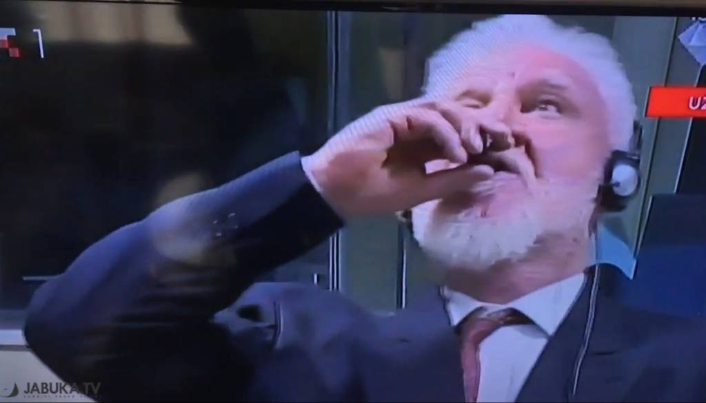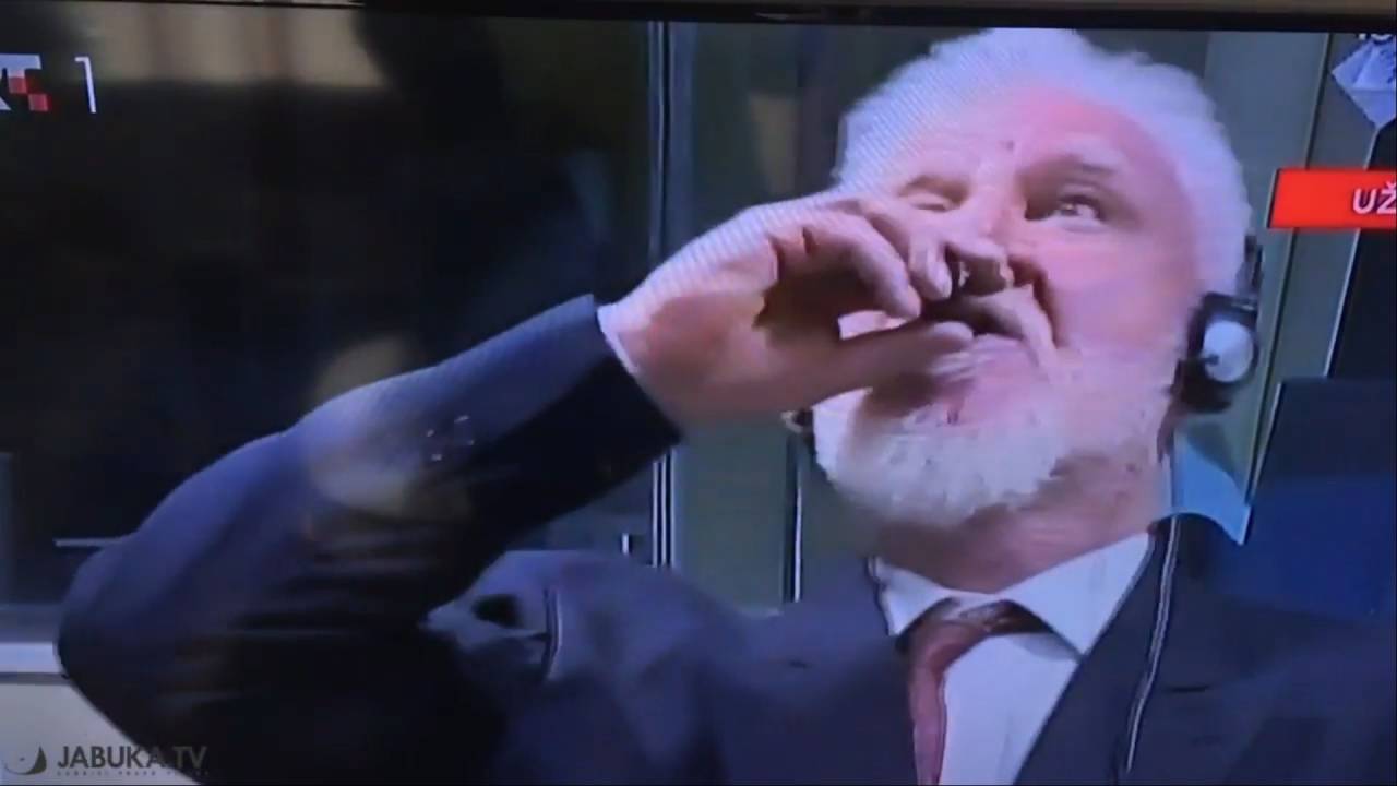 »Praljak ni zločinec in zavrača vašo sodbo,« je povedal bivši načelnik generalštaba HVO, nato pa k svojim ustnicam primaknil neko tekočino in naredil požitek, je poročala hrvaška tiskovna agencija Hina. Dogodek so ujele tudi kamere, njegov odvetnik pa je sodniku povedal, da je njegov klient spil strup.