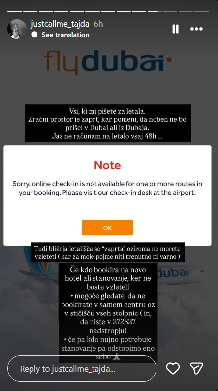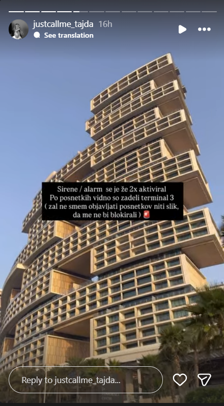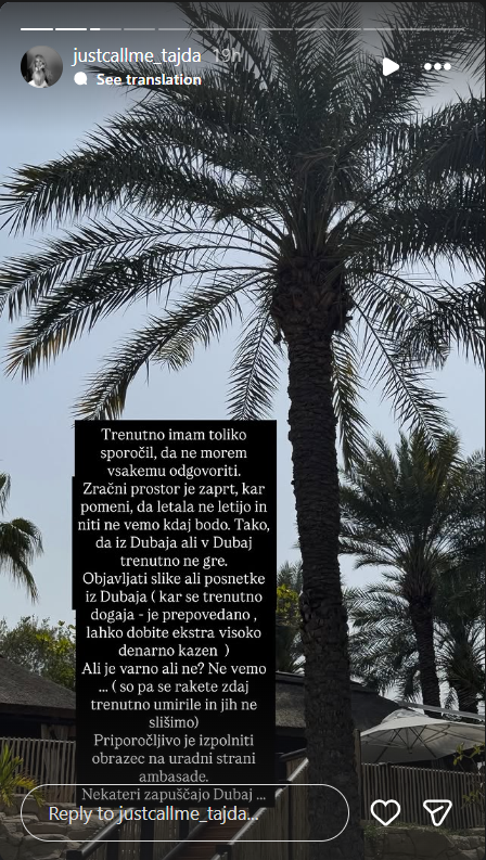 Po njenih besedah se je vsakdan v mestu spremenil. »Življenje v Dubaju … težko rečem, ker se zadržujemo v stanovanju. Zmanjšan promet in številna opozorila,« je zapisala.