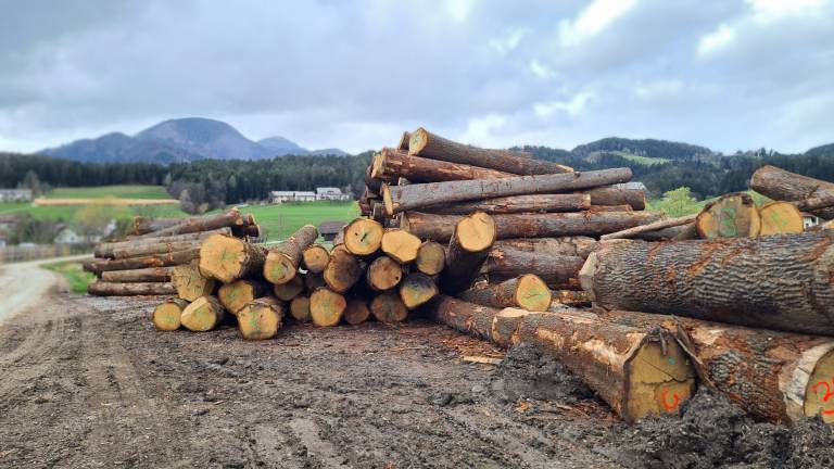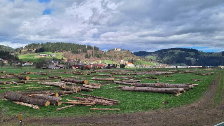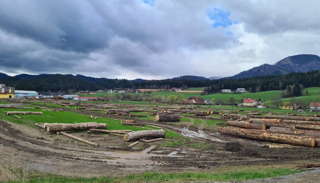 Sredi polja, na obrobju Slovenj Gradca, ležijo številni hlodi, ki še čakajo na lastnike, da pridejo po njih. Večina te hlodovine je sicer že bila prodana na uvodni 18. licitaciji, ki se je odvila 27. februarja letos.