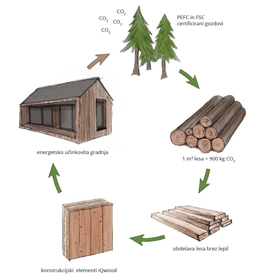 Pri gradnji soseske bo uporabljenih približno 3000 kvadratnih metrov masivnih lesenih elementov iQwood, ki s svojo naravno sestavo omogočajo zdravo, varno in energetsko učinkovito bivanje brez kompromisov.