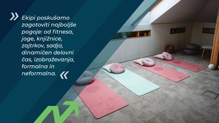 Kasneje pa ja, izjemno veliko vlagamo v razvoj posameznikov, ogromno se pogovarjamo, v katero smer želi kdo iti, kaj želi iti, kam se želi razvijati, kaj želi početi. Ekipi poskušamo zagotoviti najboljše pogoje: od fitnesa, joge, knjižnice, zajtrkov, sadja, dinamičen delovni čas, izobraževanja, formalna in neformalna. Organiziramo veliko dogodkov, kjer zaposleni lahko povabimo partnerje, družine, otroke, ki jih lahko brez težav pripeljemo tudi v službo, kjer je na razpolago otroški kotiček. Skratka, ves čas delamo na tem, ker vemo, kako težko je dobiti najboljše ljudi in ohranjati visoko stopnjo motiviranosti. Tudi zaradi tega imamo precej malo odhodov, če sploh.«