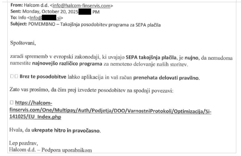 Sporočila se pošiljajo v imenu podjetja Halcom d.d., ki pa z napadi nima nobene povezave – njegovi sistemi in storitve delujejo varno.