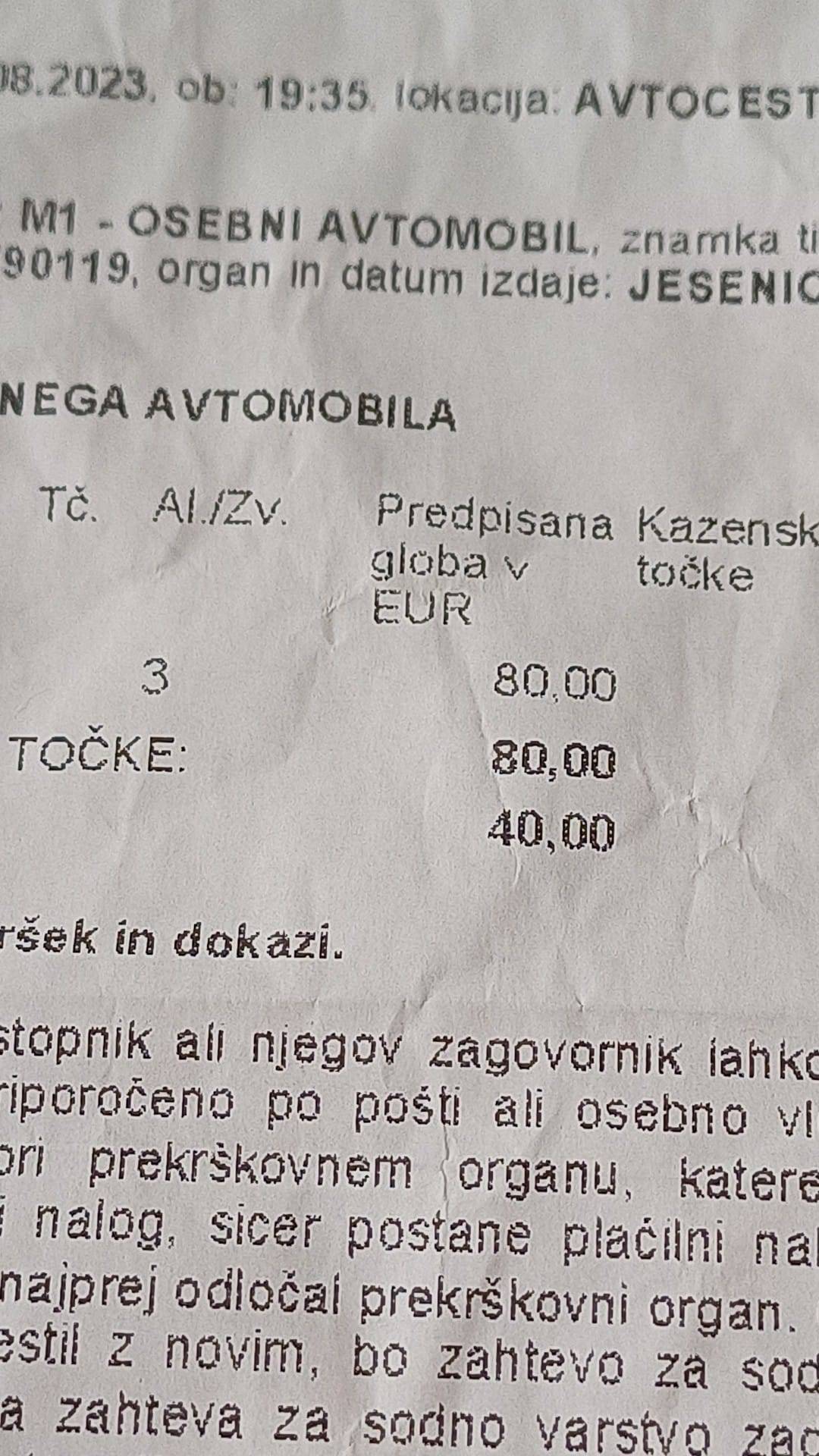 »Pazite, kako prehitevate na avtocesti, kajti več kot dva avta ne smeš prehiteti in se moraš vrniti nazaj na vozni pas. Če pa vztrajaš in voziš na levi strani tako kot ostali, te pa doleti tole: 80 evrov (40 evrov) kazen. 30. 8. pa je bila na cesti grozna gužva in policija tako lovi žrtve,« se glasi zapis.