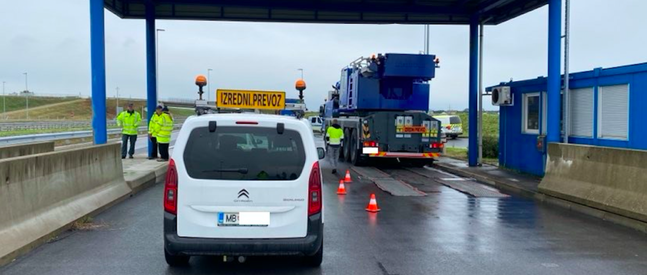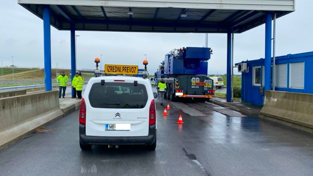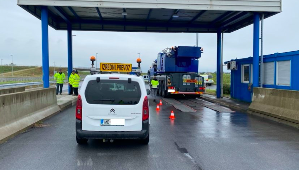 Možje v modrem izpostavljajo hrvaškega voznika tovornega vozila za prevoz vozil, ki je v jutranjem času na tovornem delu vozila prevažal drugo vozilo. Ker je bil zaradi tega preobremenjen, so mu policisti izrekli globo.